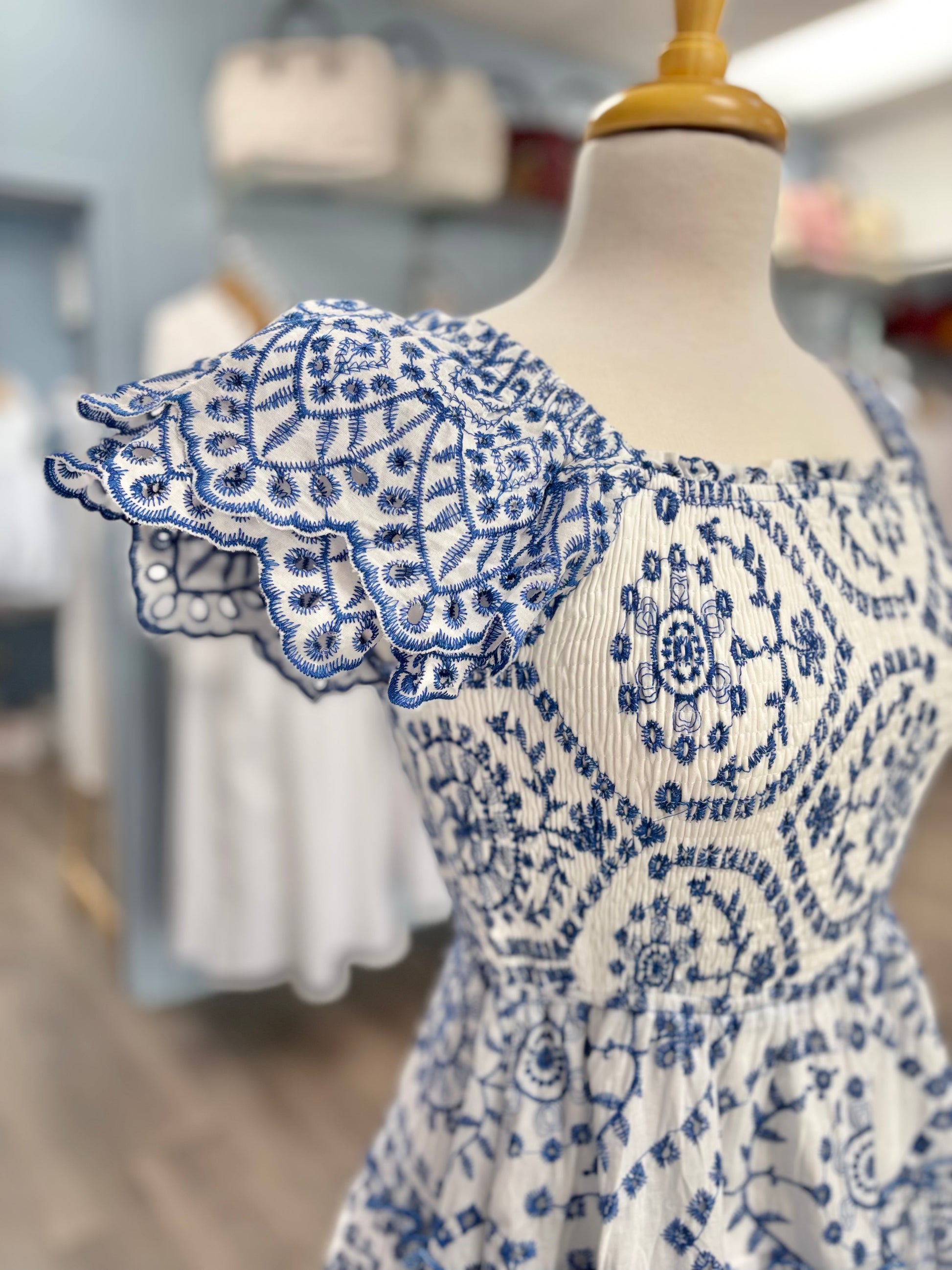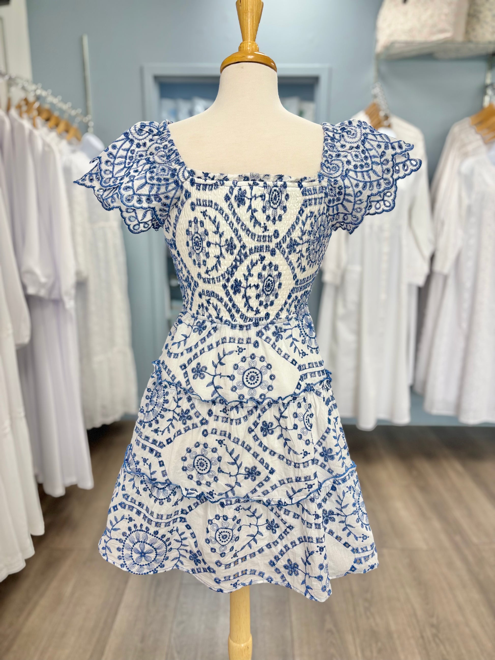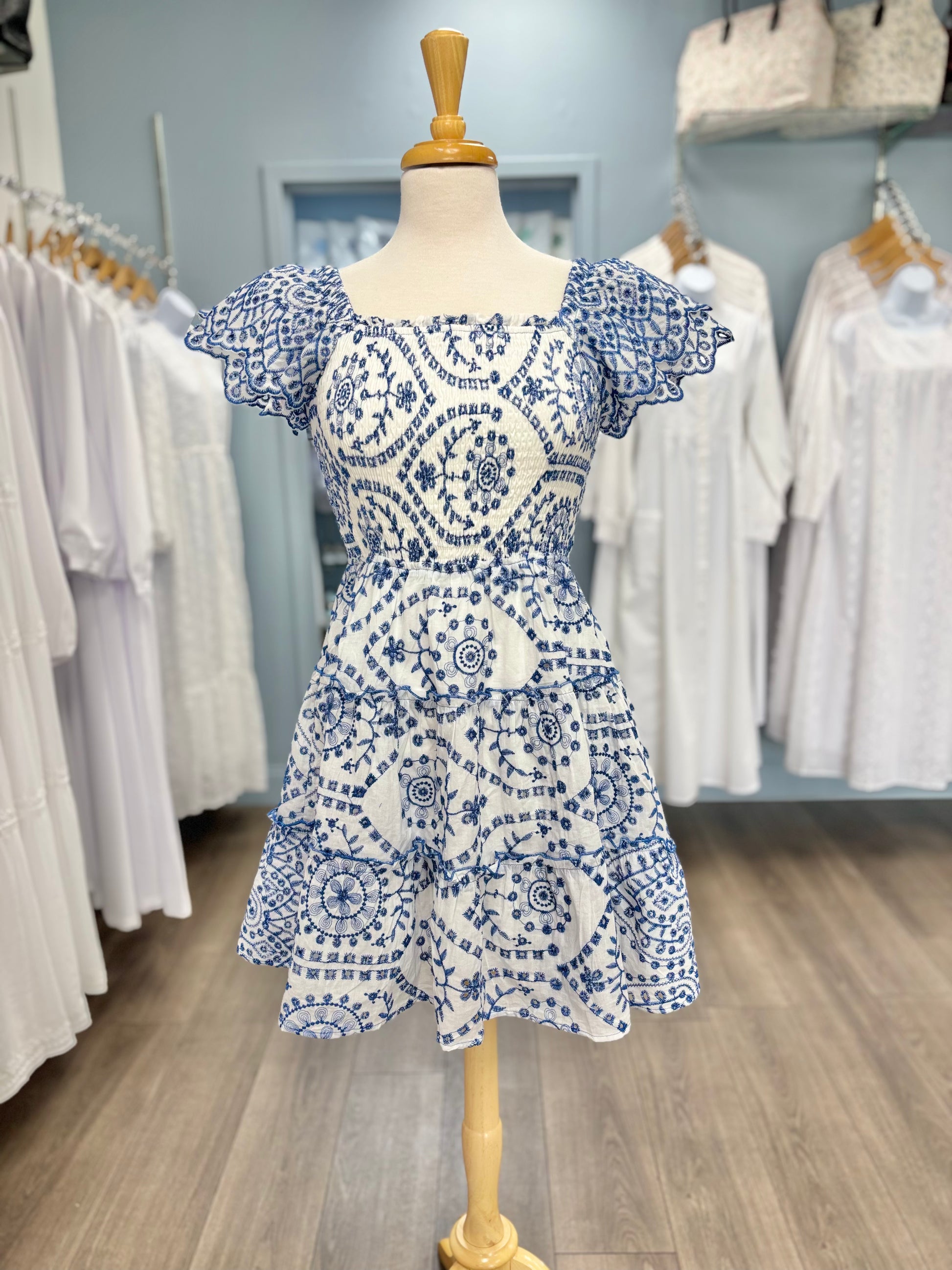 We love this adorable, embroidered dress! The layered flutter sleeves are the perfect complement to the smocked bodice and square neckline. To make it even better, this dress has pockets! This dress hits at the knee and is perfect for your next dace, family pictures or just for fun!