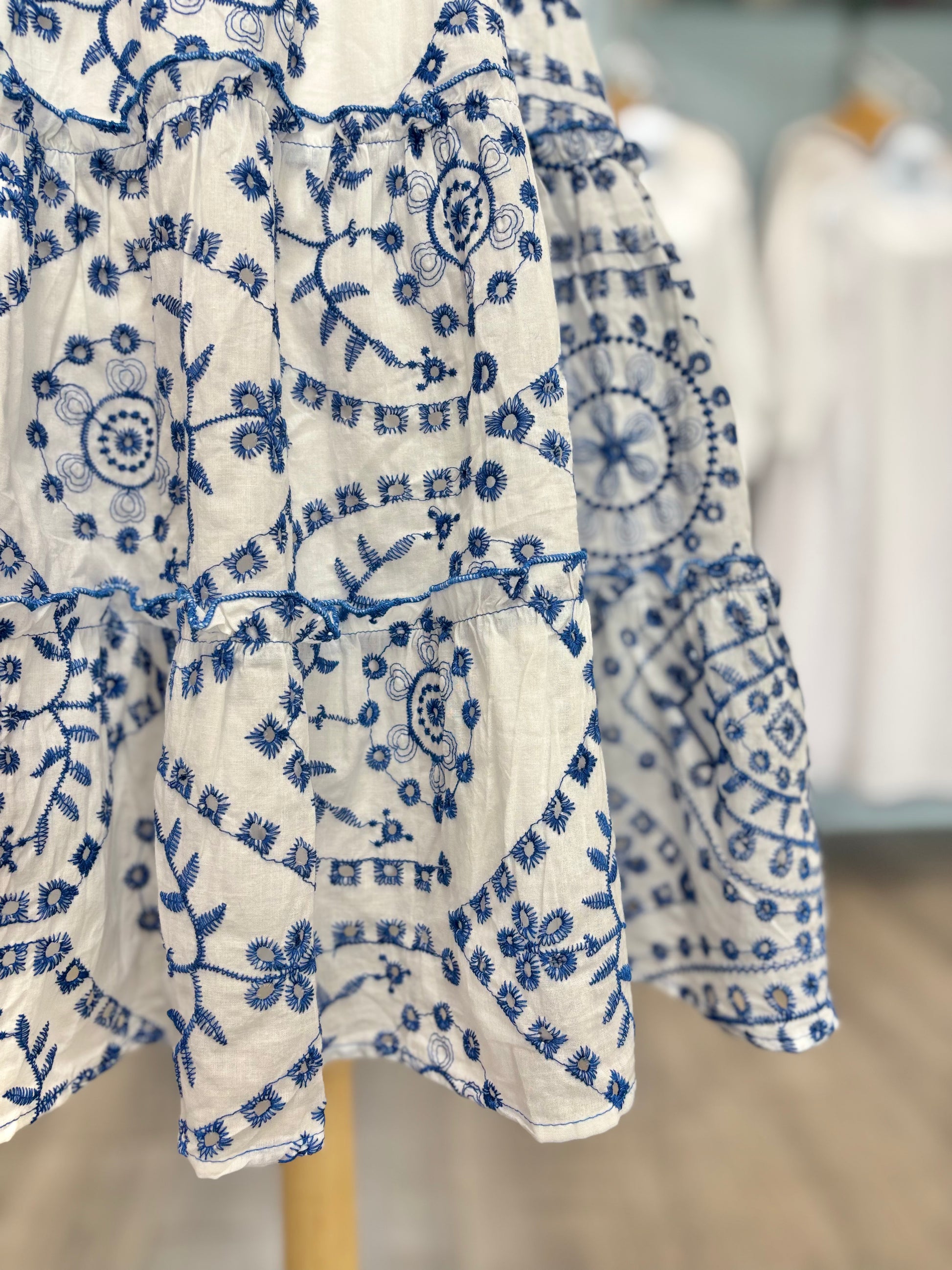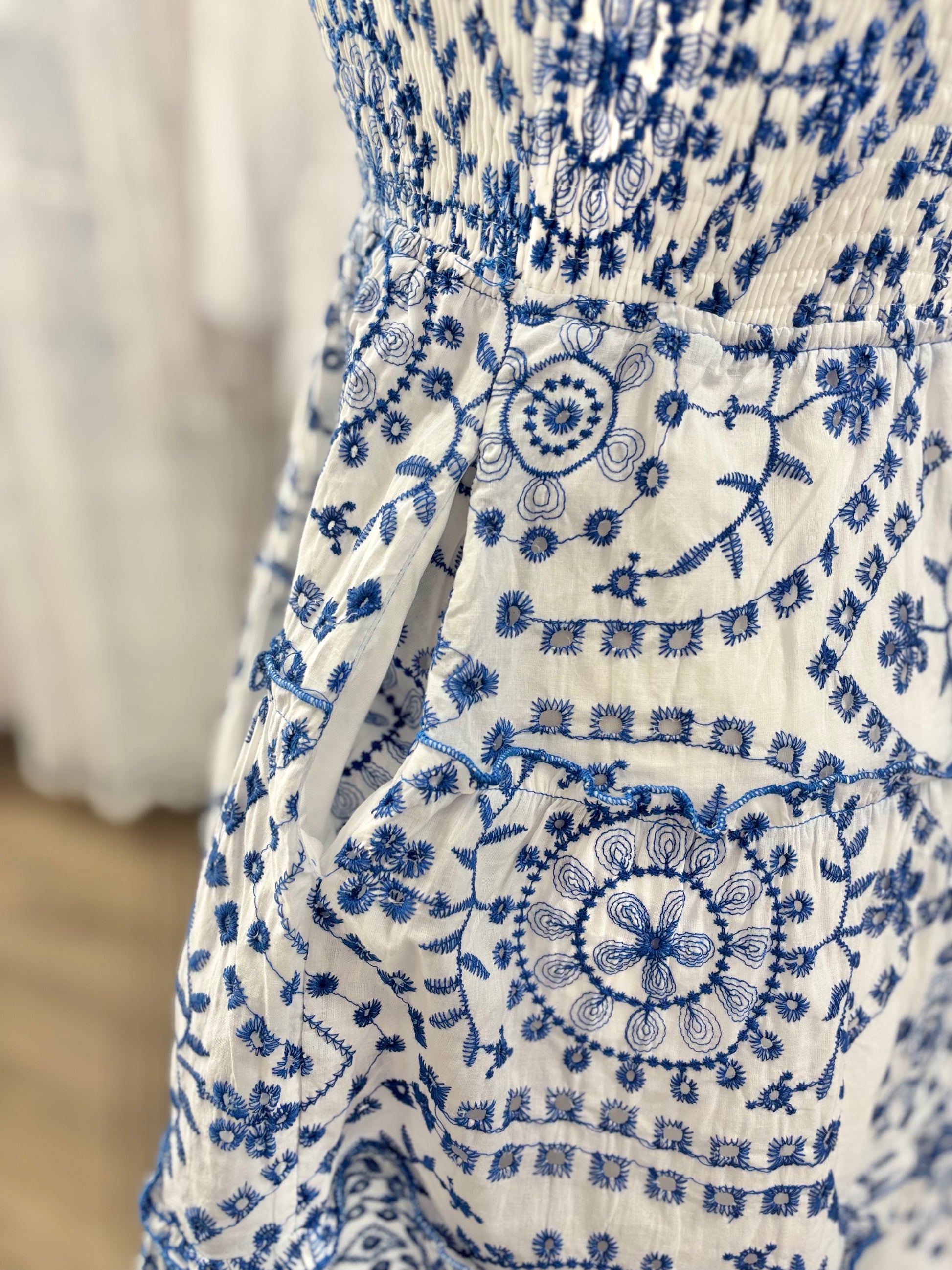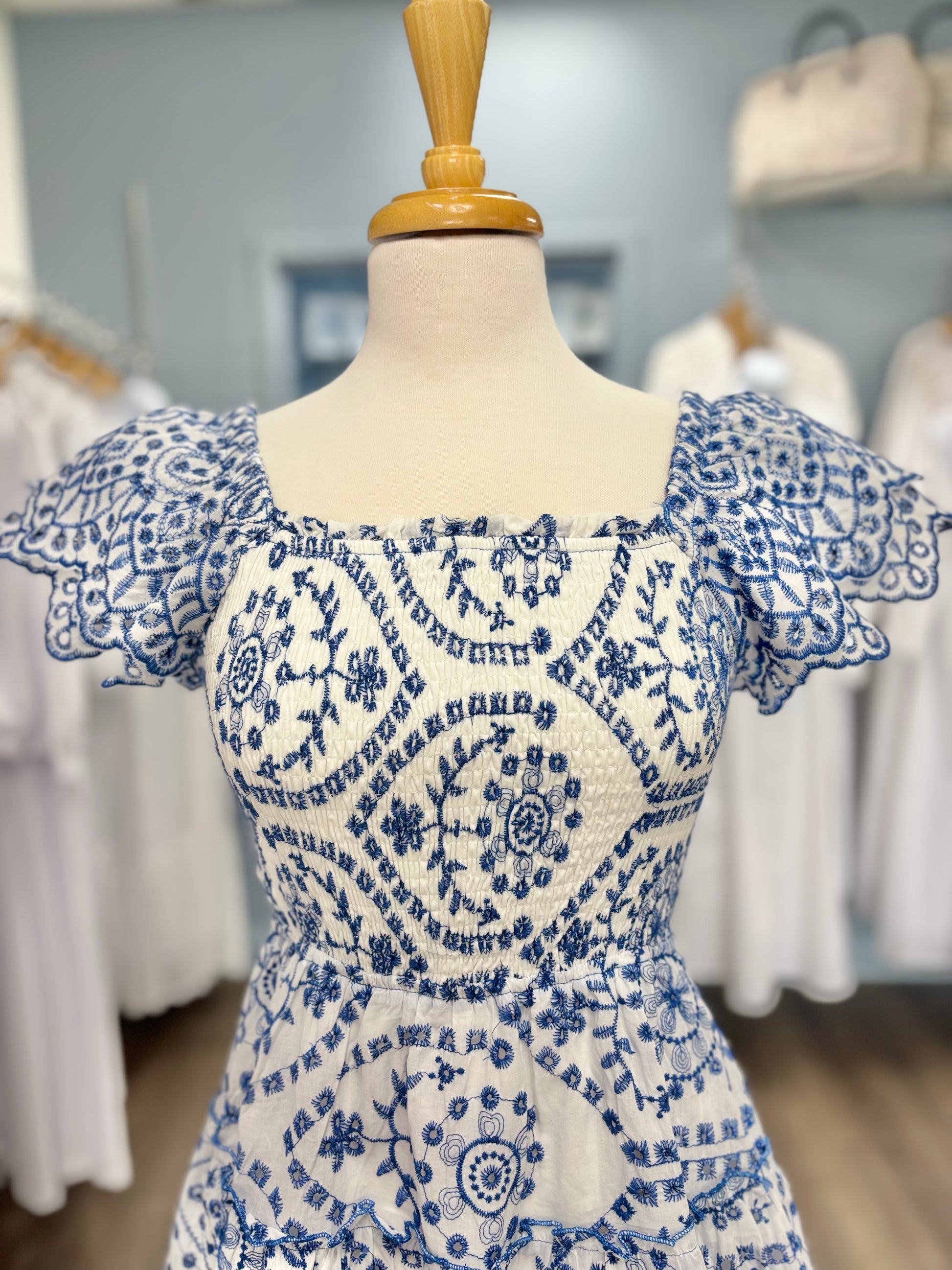 We love this adorable, embroidered dress! The layered flutter sleeves are the perfect complement to the smocked bodice and square neckline. To make it even better, this dress has pockets! This dress hits at the knee and is perfect for your next dace, family pictures or just for fun!