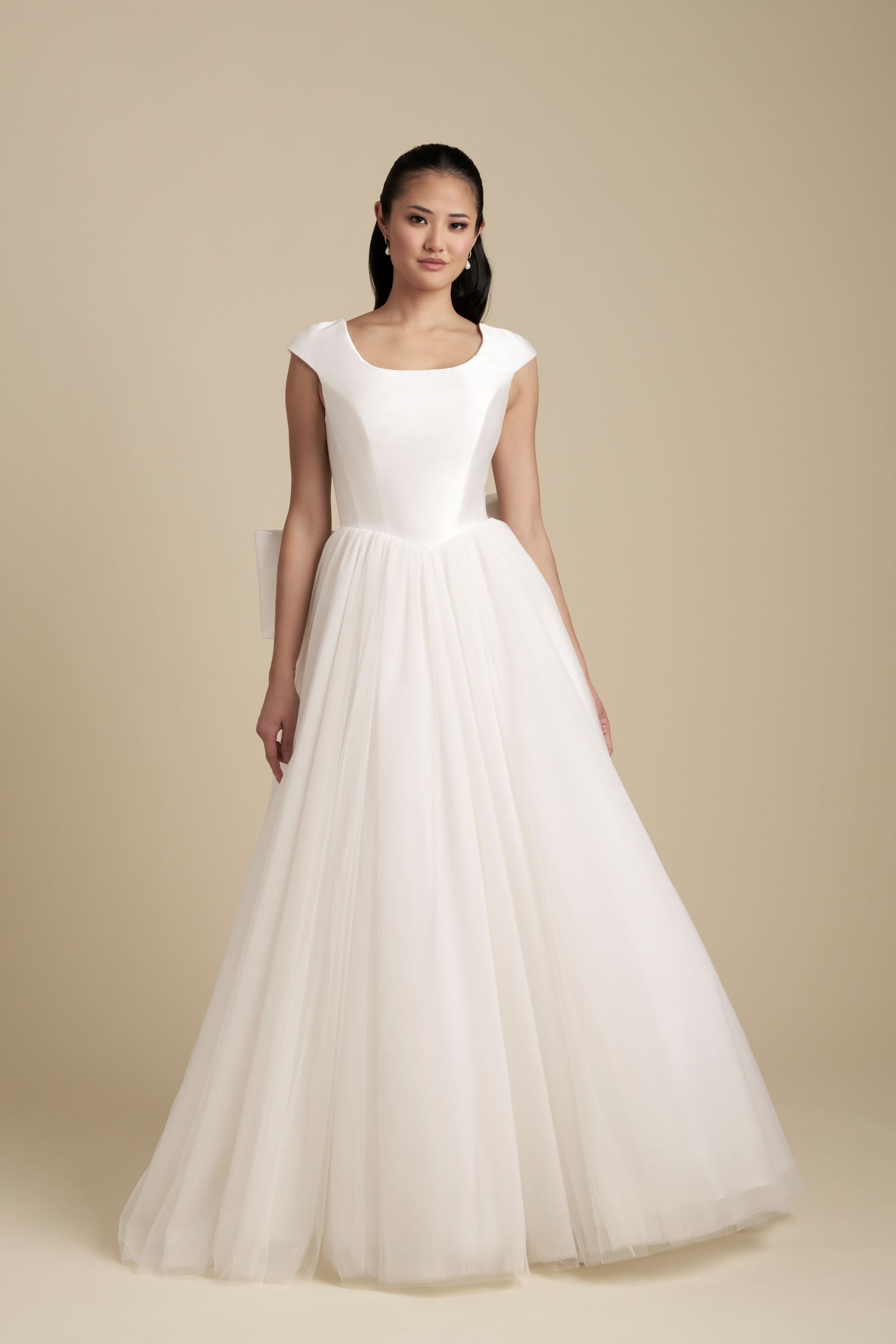 This modest ballgown has a scoop neckline and cap sleeved bodice made out of elegant Mikado fabric with a Basque waistline. The full tulle skirt has a matching Mikado bow in the back. This dress also has buttons down the back that fall down the train.