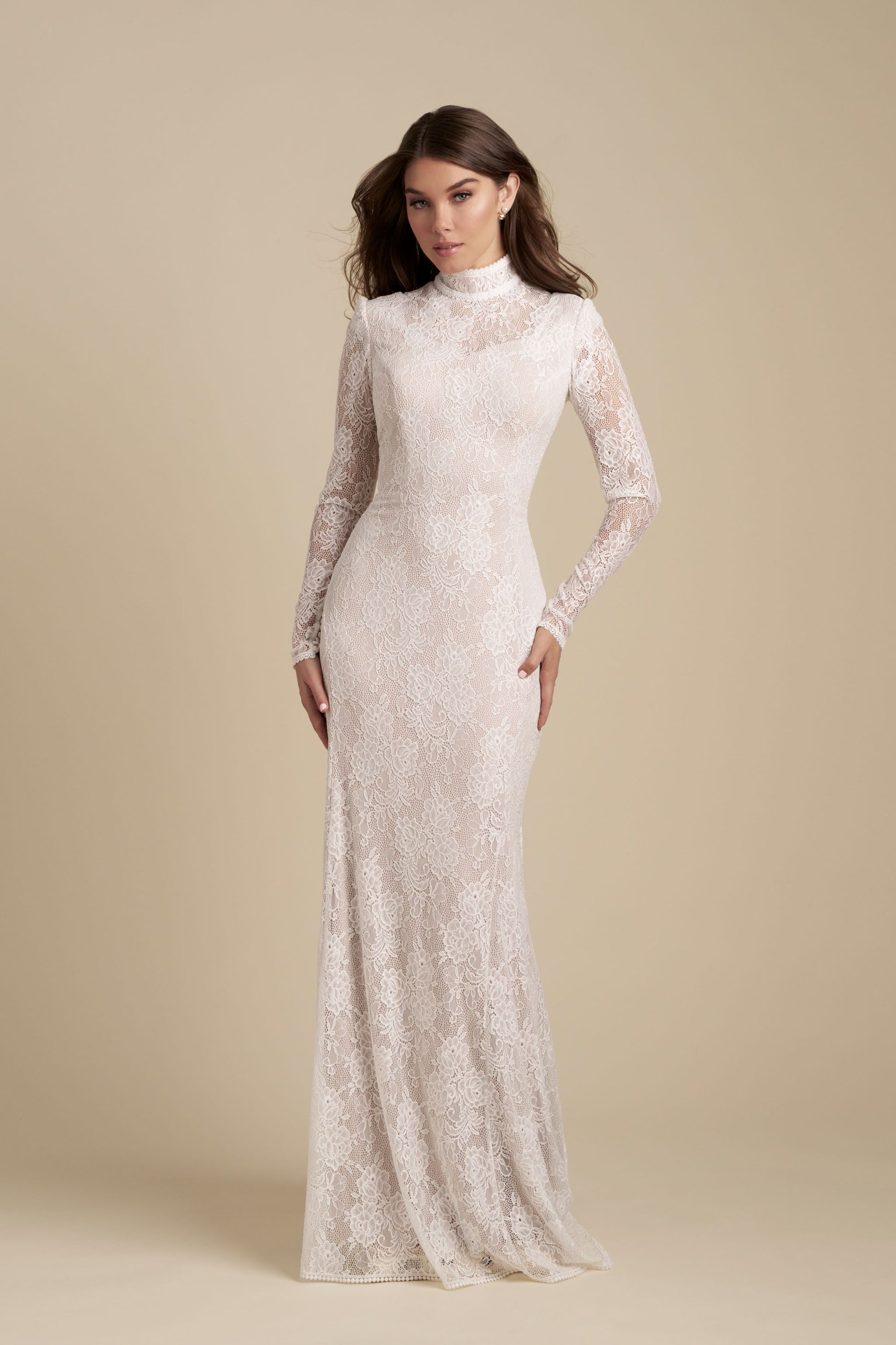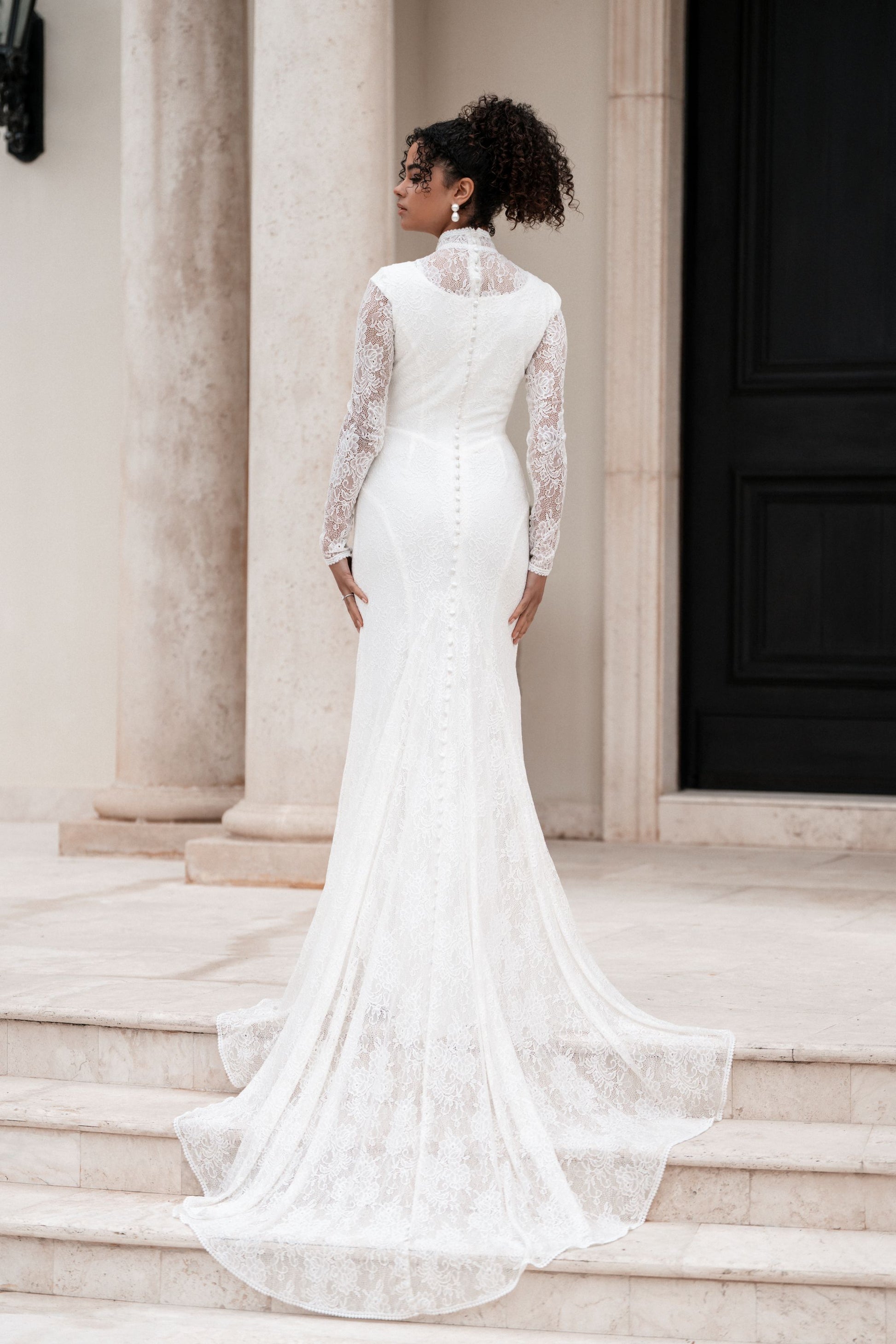 This sheath gown is simply elegant with the high neckline, long sleeves and soft Chantilly lace. The sheer train has buttons all the way down the back, completing the classic bridal look.
