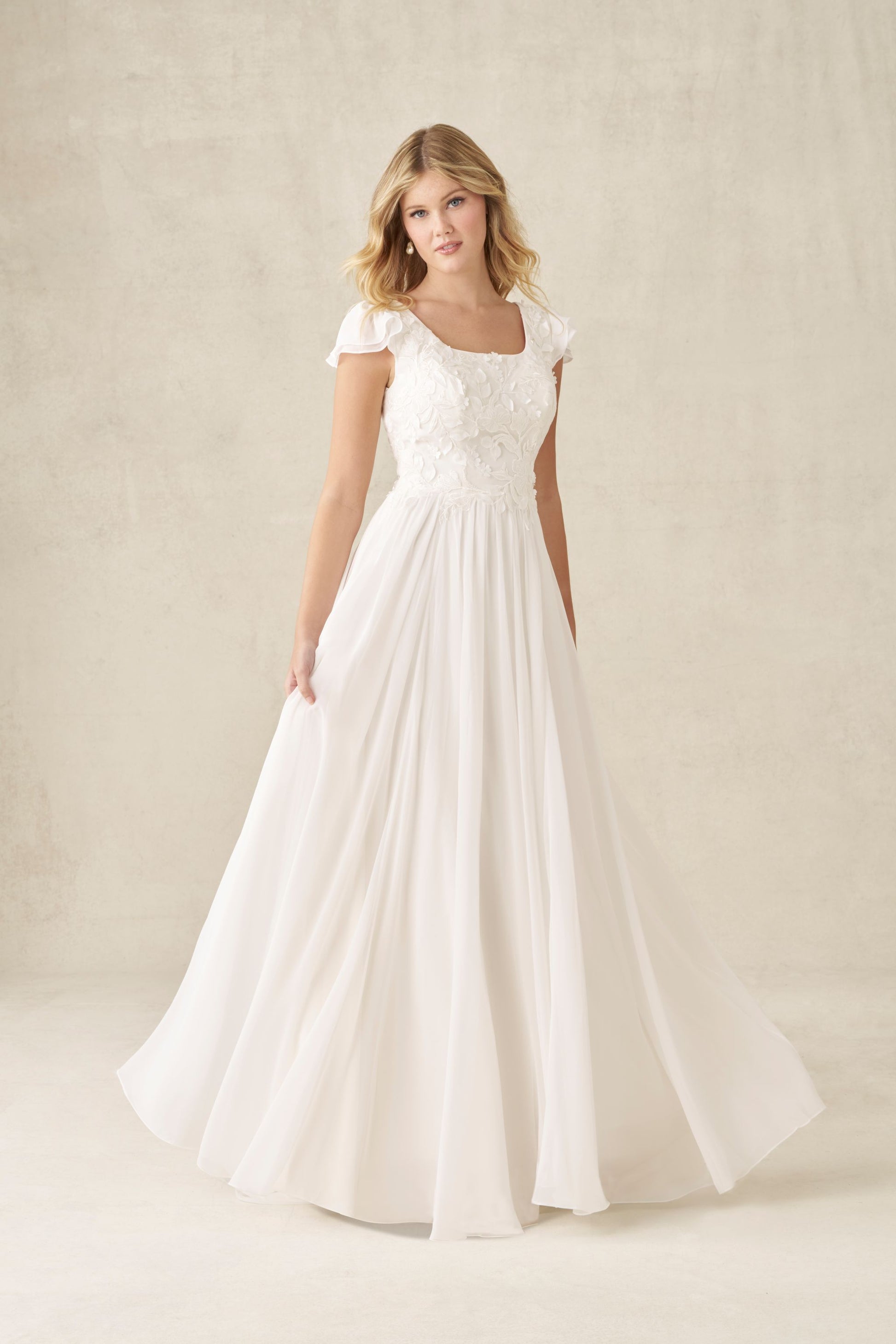 This gown features a flowing chiffon skirt and a fitted bodice, adorned with dimensional lace appliques and soft fluttery chiffon cap sleeves. This dress is both graceful and modern with a soft rounded square neckline and buttons down the back.
