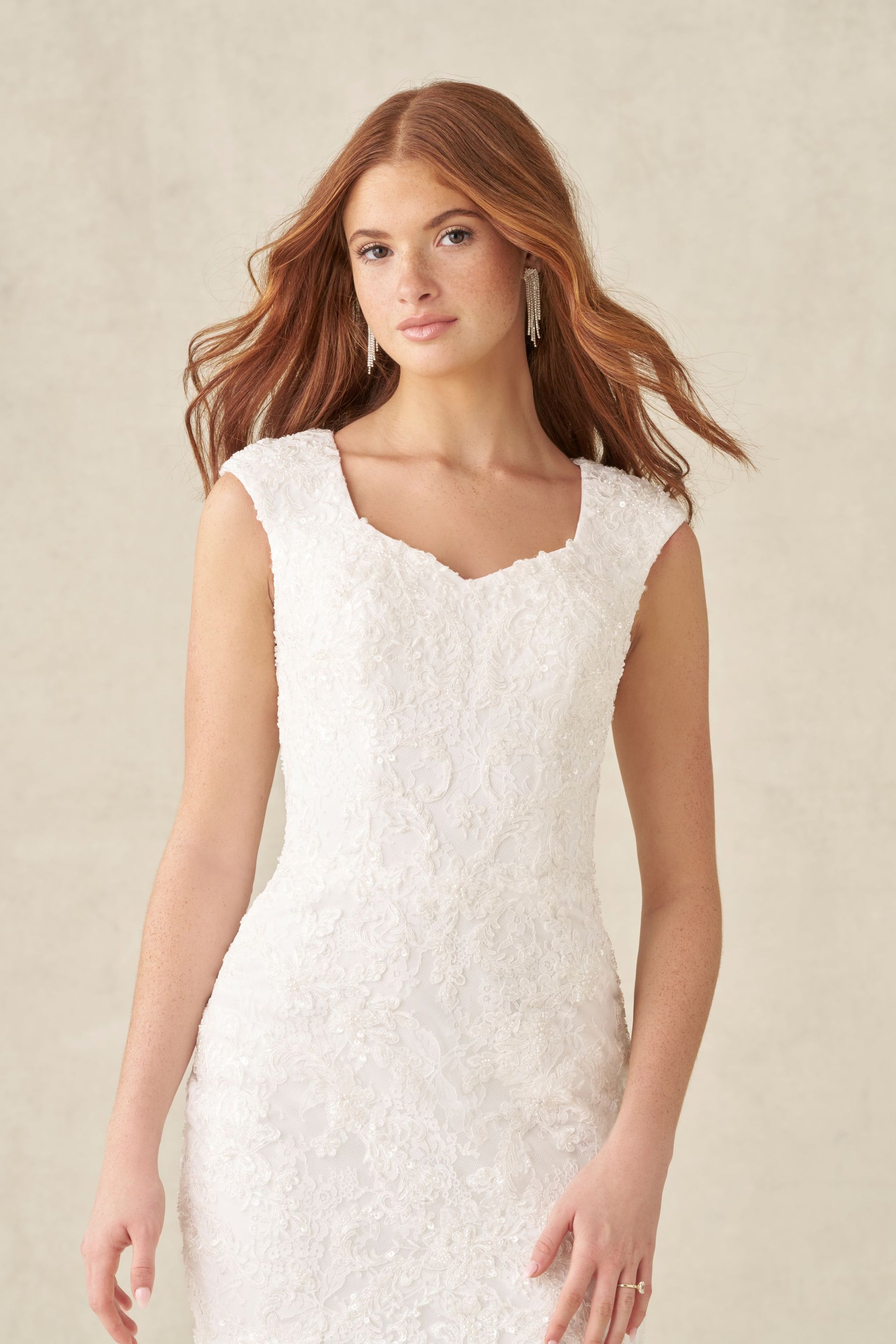 This fit-and-flare gown features a modest sweetheart neckline and a bodice adorned with lace appliques and subtle beading. The silhouette gently hugs the figure before flowing into a graceful skirt, offering a sophisticated and timeless bridal look.