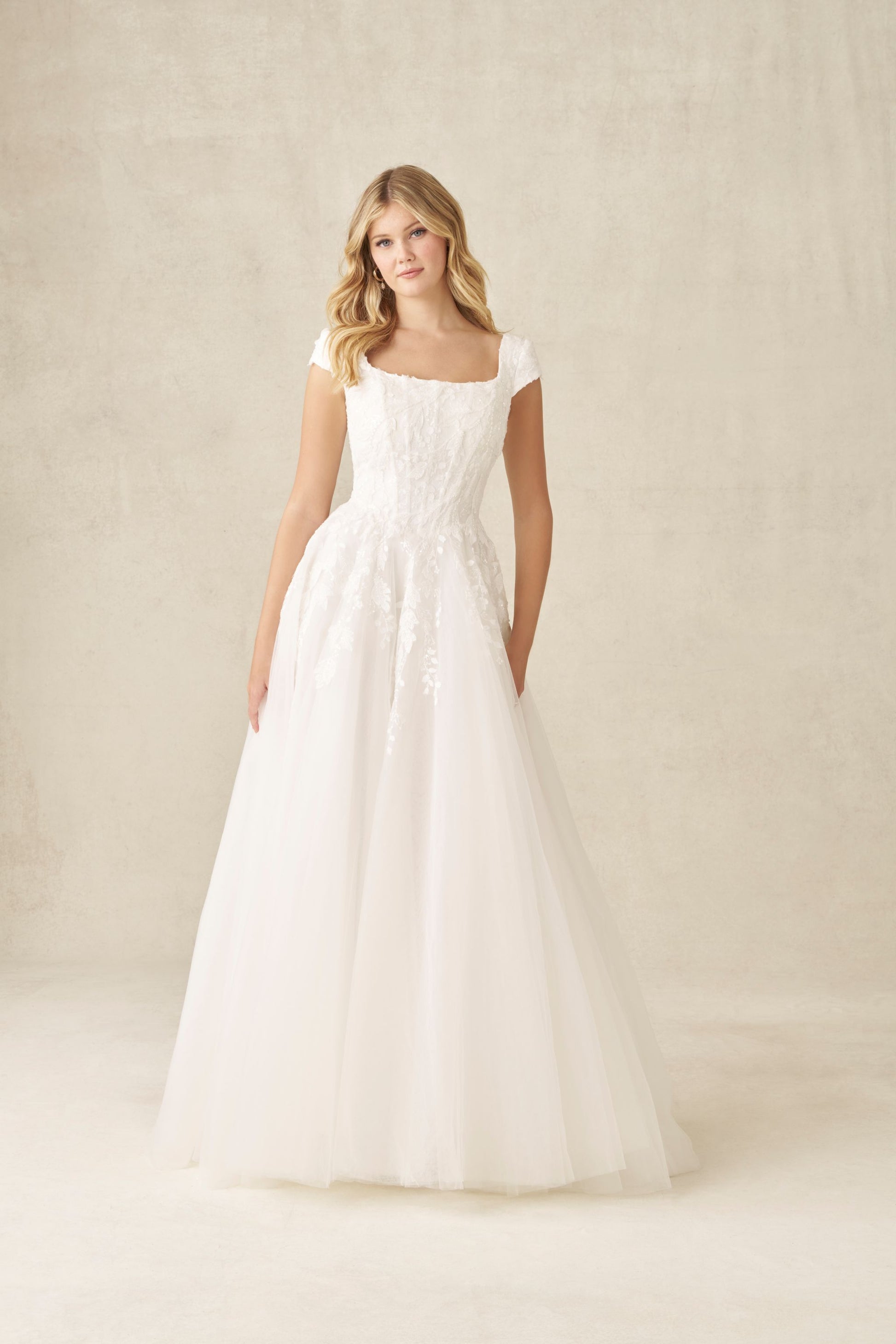With a modest scooped neckline and cap sleeves, this gown is both romantic and elegant. The lace bodice extends down into the tulle A-line skirt, creating a flowing, refined silhouette. Buttons go down the back zipper and train.