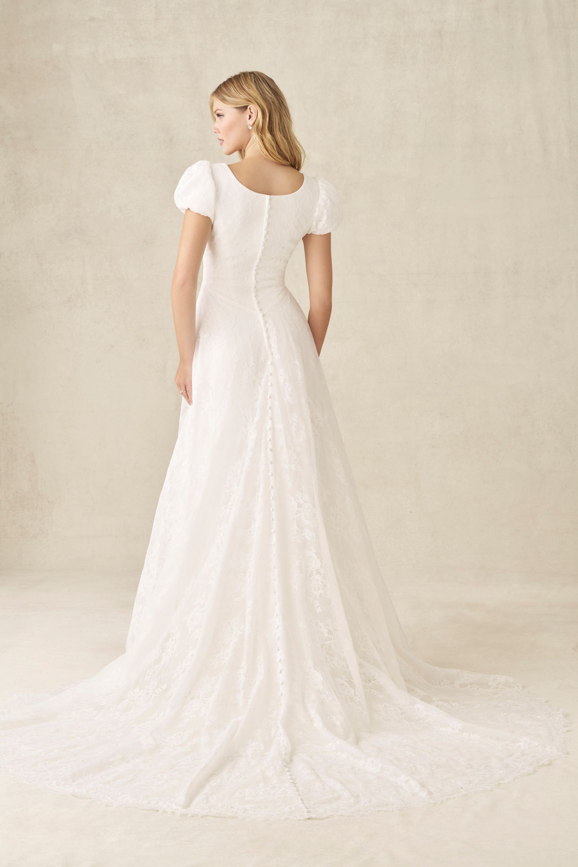 This Chantilly lace gown features a modest sweetheart neckline with short puff sleeves, creating a soft and elegant look. A defined Basque waistline flows into an airy A-line skirt creating a graceful and timeless silhouette.